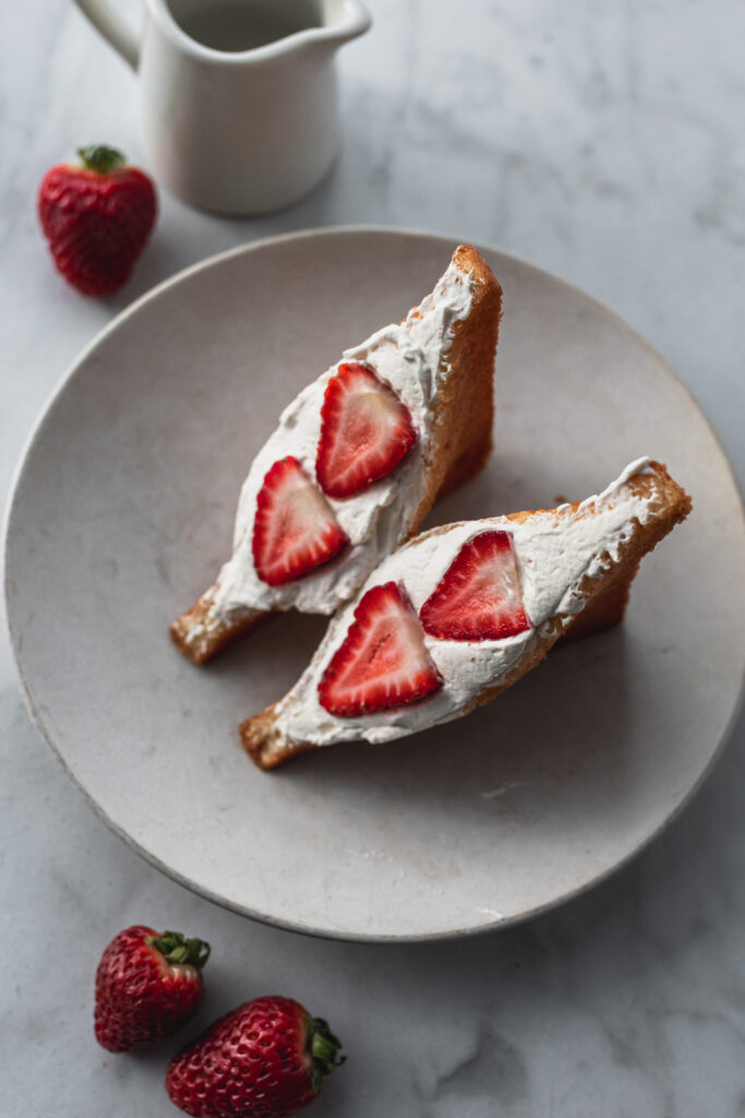 - Prep strawberries. While the bread cools, wash the strawberries and trim the tops. Cut each strawberry into half. Blot dry the strawberries with a paper towel. Set aside.