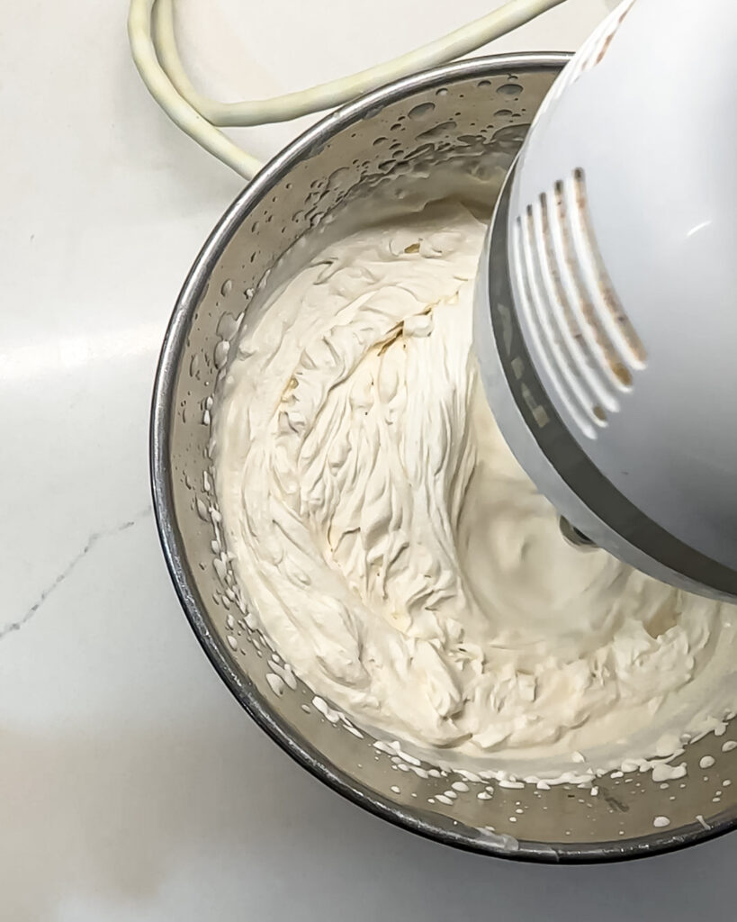 - Make the whipping cream. In a small bowl, add the heavy cream, sugar, and vanilla. Using a hand-held mixer, whip on the highest setting until stiff peaks form, about 2 minutes. Set aside.