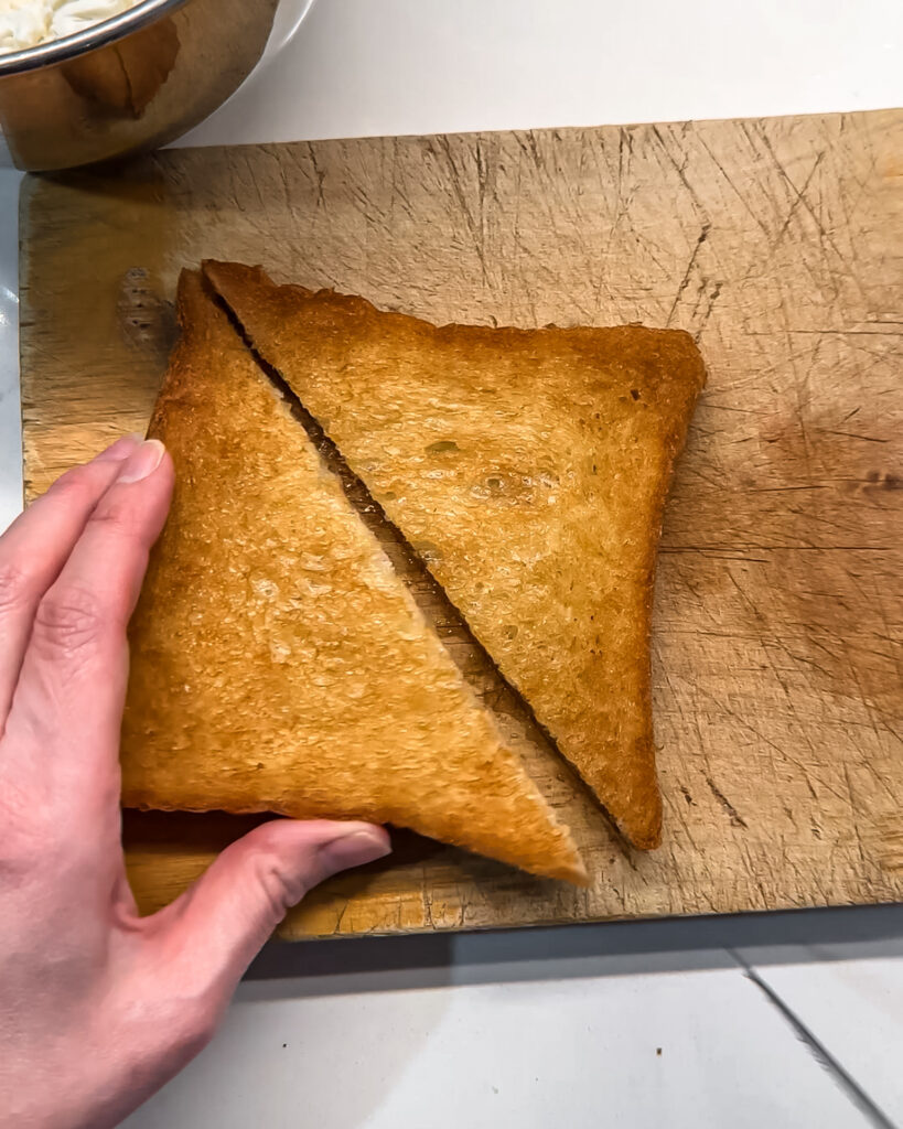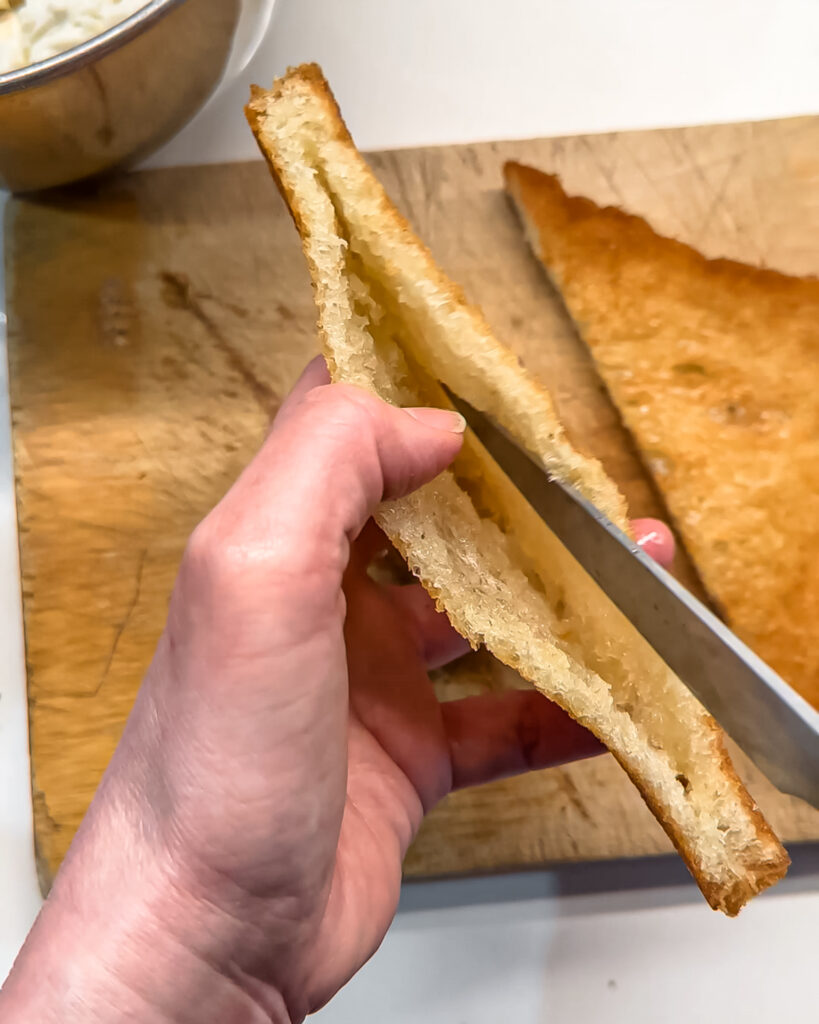 - Create a pocket. Using a sharp knife, cut each slice of toast diagonally. Then cut a slit into each half, as far as you can get to the edges without cutting through the crust. Gently open the sides of the toast to form a pocket. Be gentle!