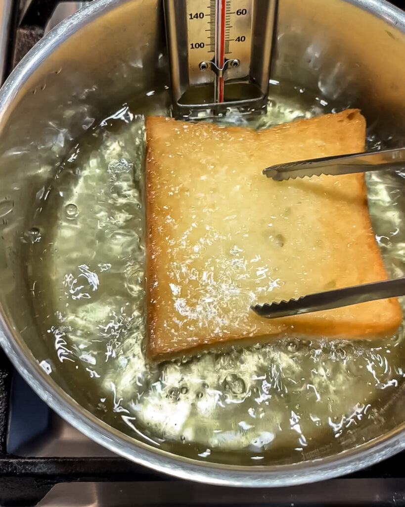 - Deep fry the milk bread. Attach a candy thermometer to a heavy bottom medium pan or enameled cast iron dutch oven. Add 1 inch of neutral cooking oil (avocado oil, canola oil, or grapeseed oil, etc.). Heat over medium heat until the thermometer reads 350F/176C. Add a slice of milk bread and deep fry until golden brown, about 30-60 seconds per side. Make sure to flip the bread and watch carefully so it’s evenly cooked. Remove and set aside on a wire rack fitted over a sheet pan.
