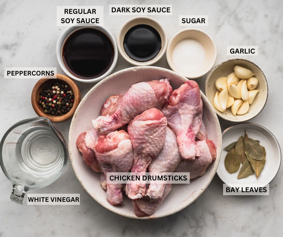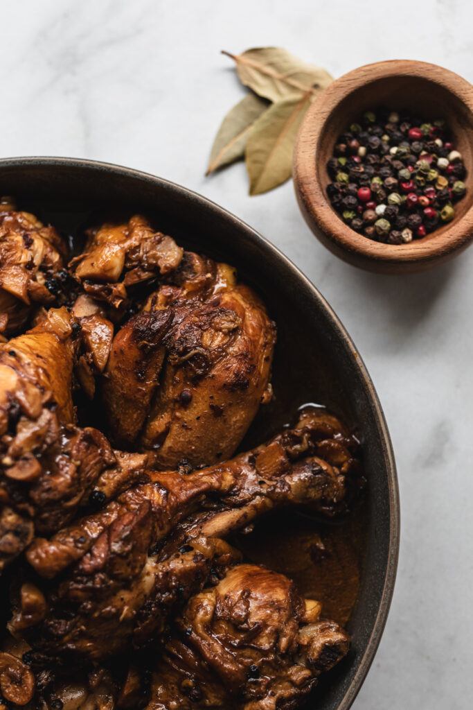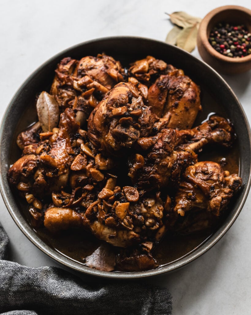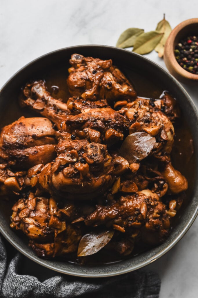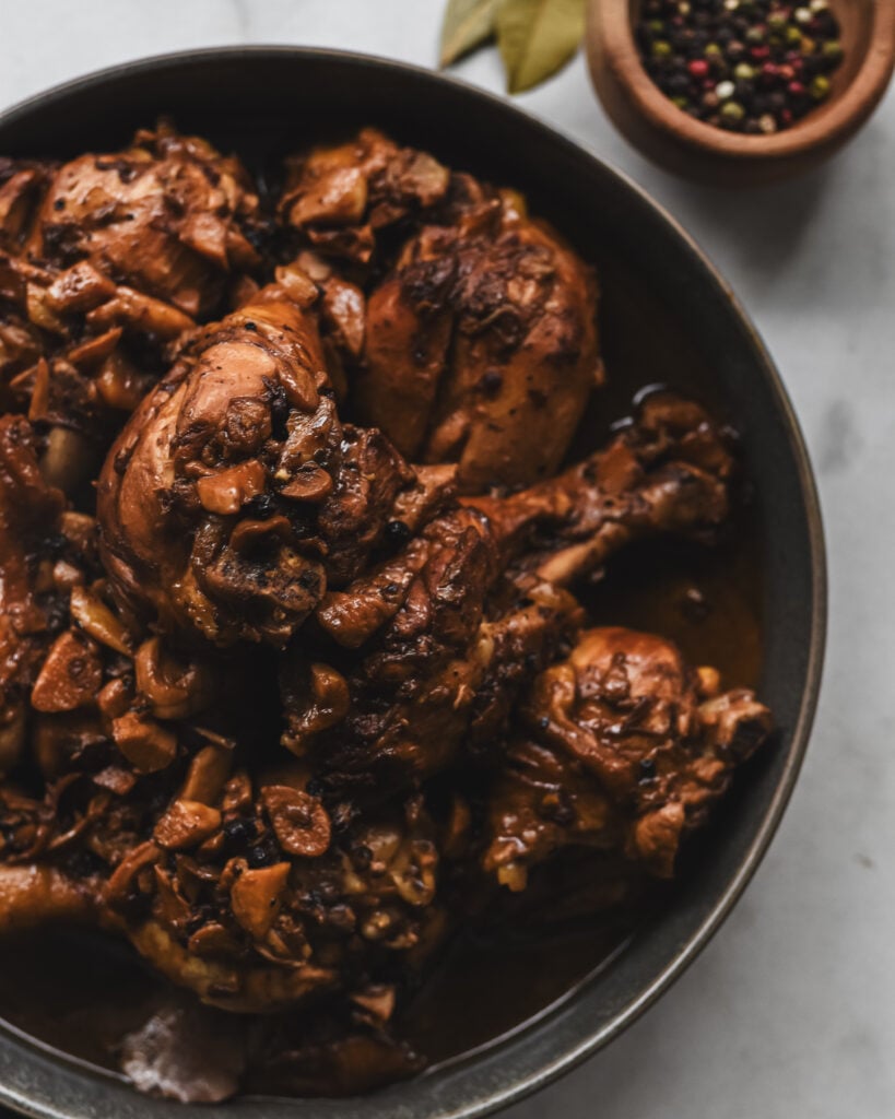 Another important flavor element are the aromatics. Plenty of garlic, bay leaves, and black peppercorns add depth and flavor. They are cooked in oil until fragrant and slightly browned. Then braised with chicken, together with soy sauce and vinegar, to create a complex, mouth-watering final dish.