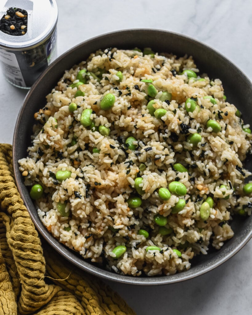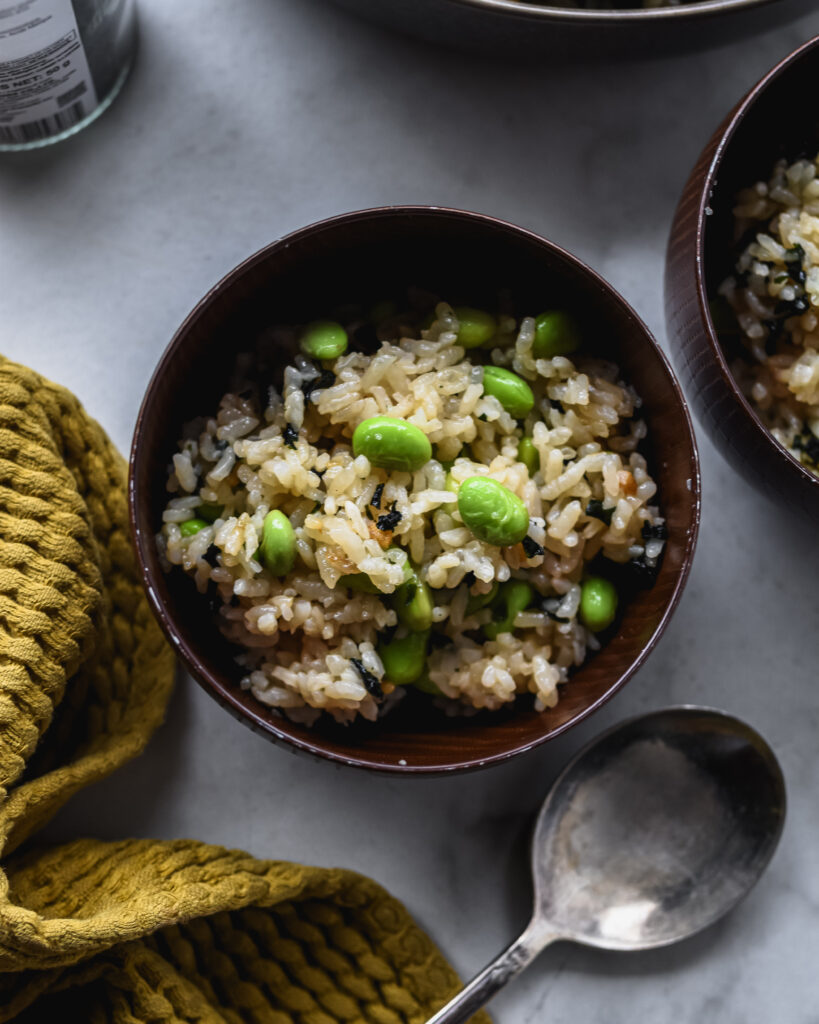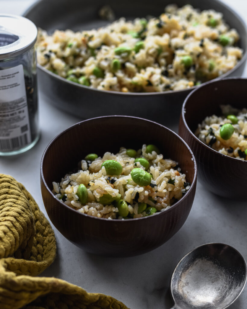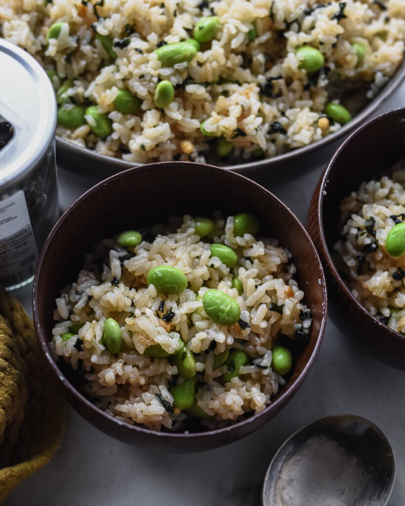 The chewy, slightly sticky rice is seasoned with soy sauce and dashi broth for more flavor. The edamame adds freshness and mild nuttiness. Sprinkling Wakame Chasuke Furikake all over is the final touch and adds a salty, crunchy bite!